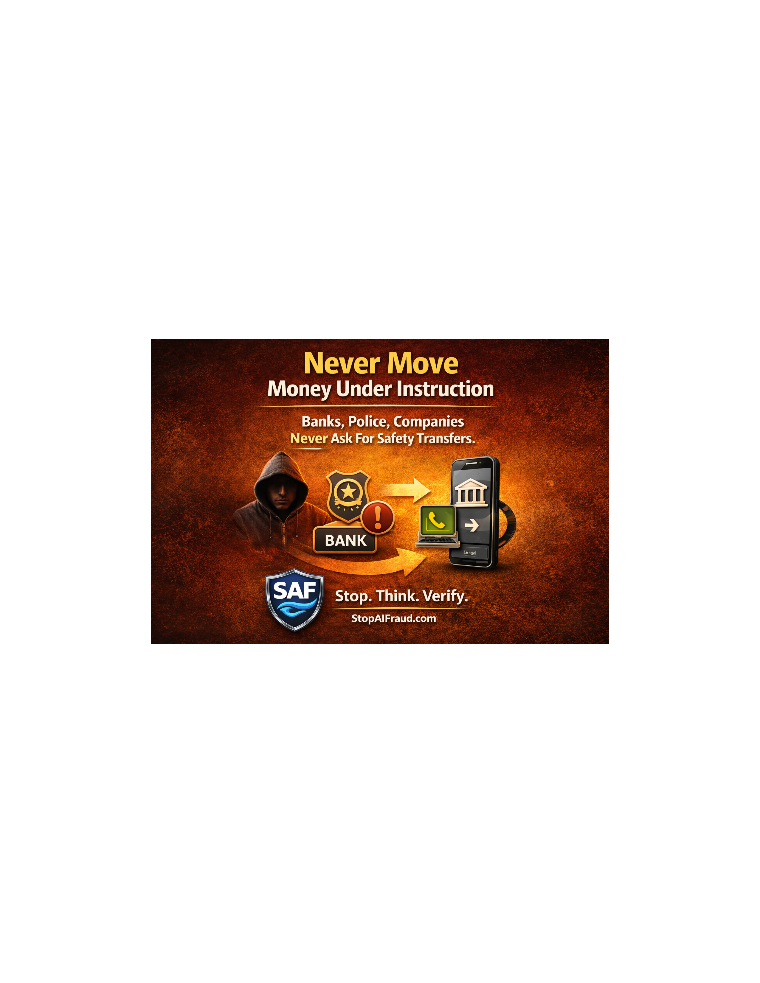 Legitimate institutions never ask you to move money for 'safety' or 'security.' This tactic is exclusively used by scammers. Your money is safest staying where it is.