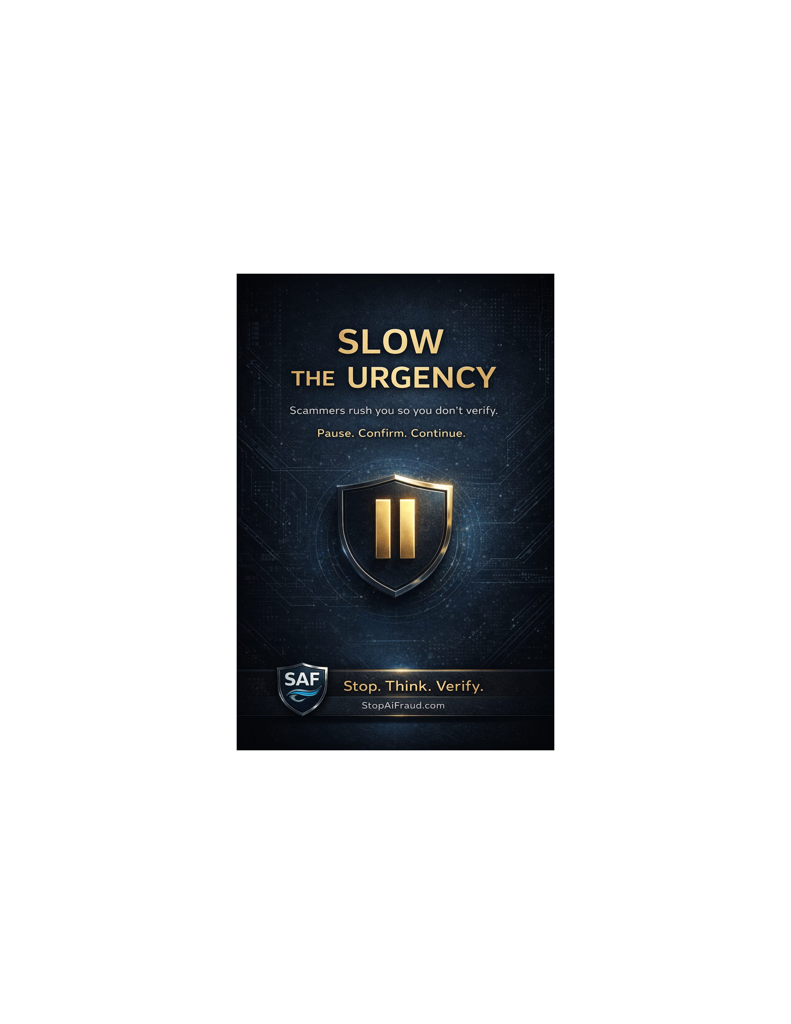 All posters include StopAiFraud.com branding with our tagline: "Stop. Think. Verify."